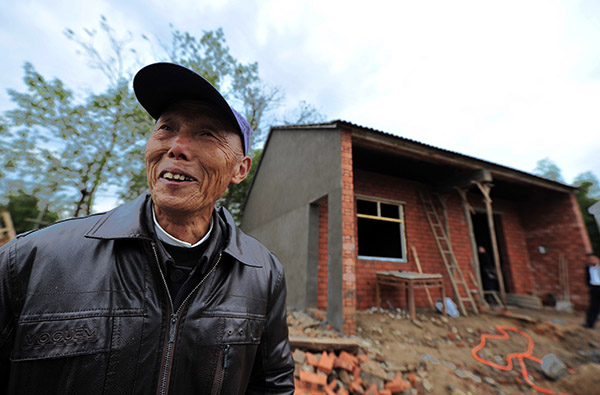 11月8日,宣城市宣州区洪林镇施村村民杨家友站在自己的新房前。杨家友的房屋今夏被洪水冲倒,在多项优惠政策的支持下,他的新房已经完成主体工程,即将竣工。