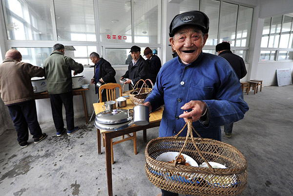 11月9日,宣城市宣州区五星乡敬老院孤寡老人郭后发在餐厅打饭。